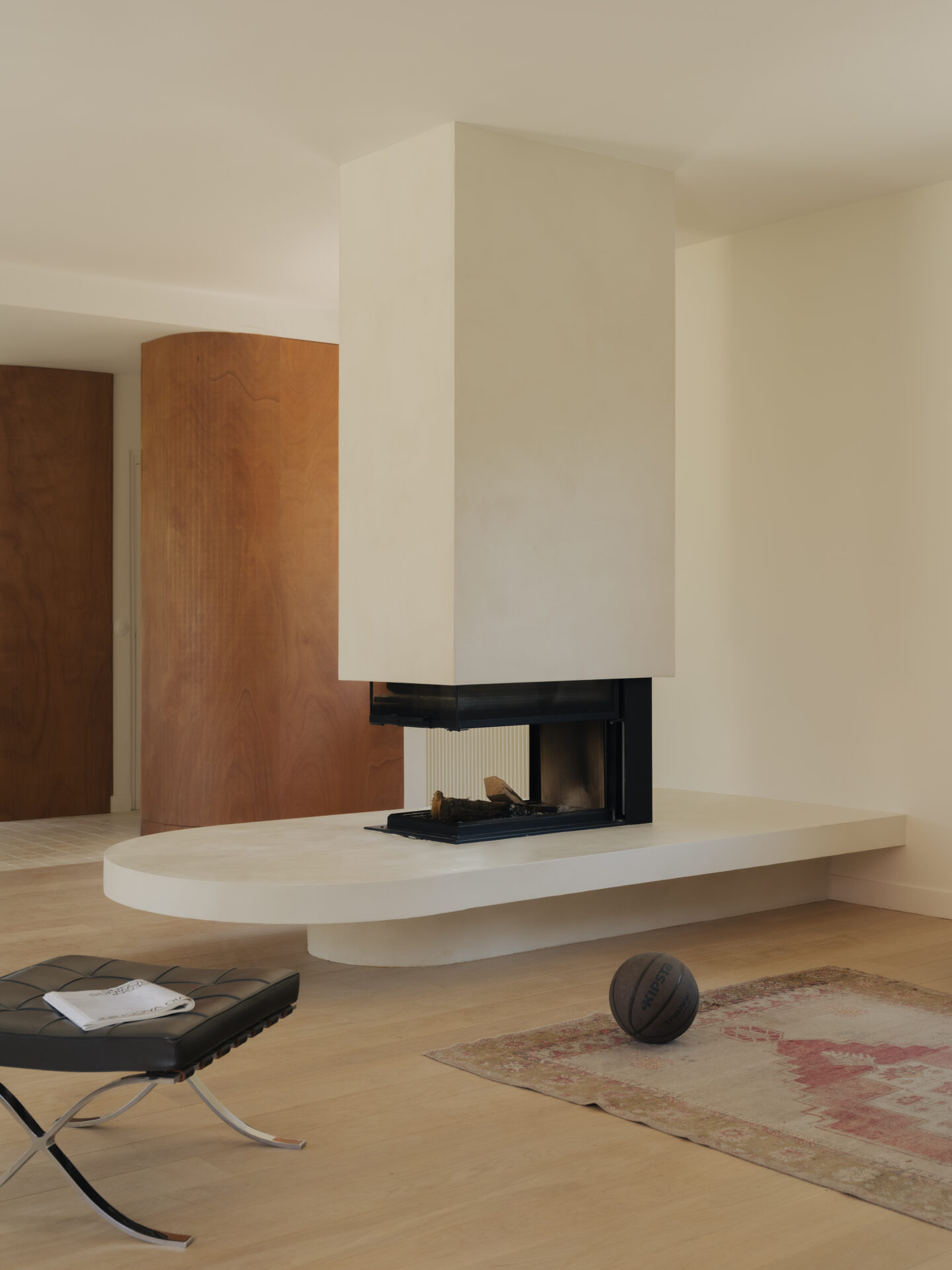 La cuisine a conservé son emplacement mais a été totalement ouverte. La cheminée a été remplacée par une structure plus contemporaine, à foyer ouvert sur trois côtés avec une banquette volontairement surdimensionnée afin de s’y asseoir et de stocker des bûches à sa base.