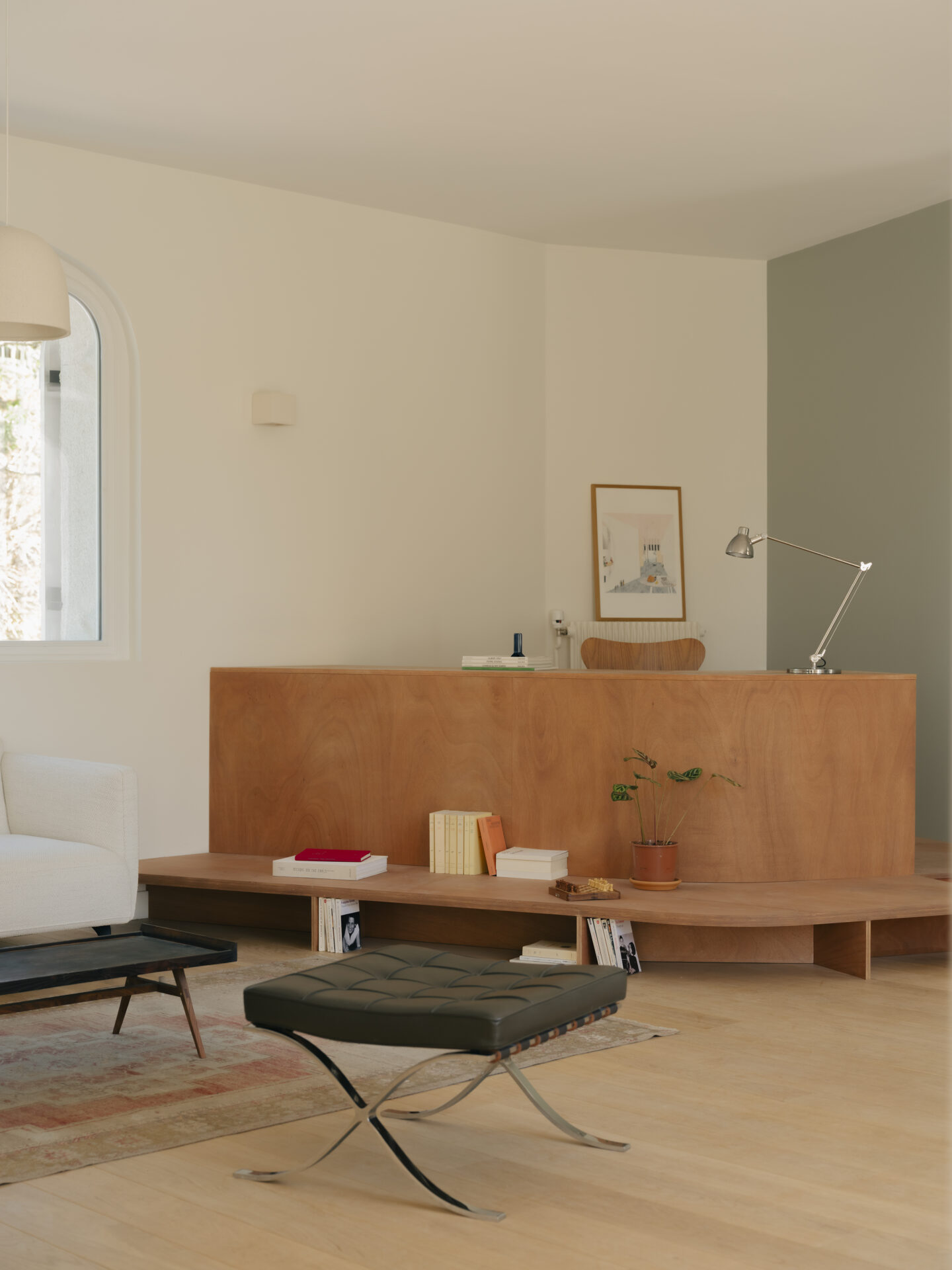 Cela a permis de restructurer les dimensions très importantes du salon en le réduisant et en créant un espace de travail dédié, demande des propriétaires.