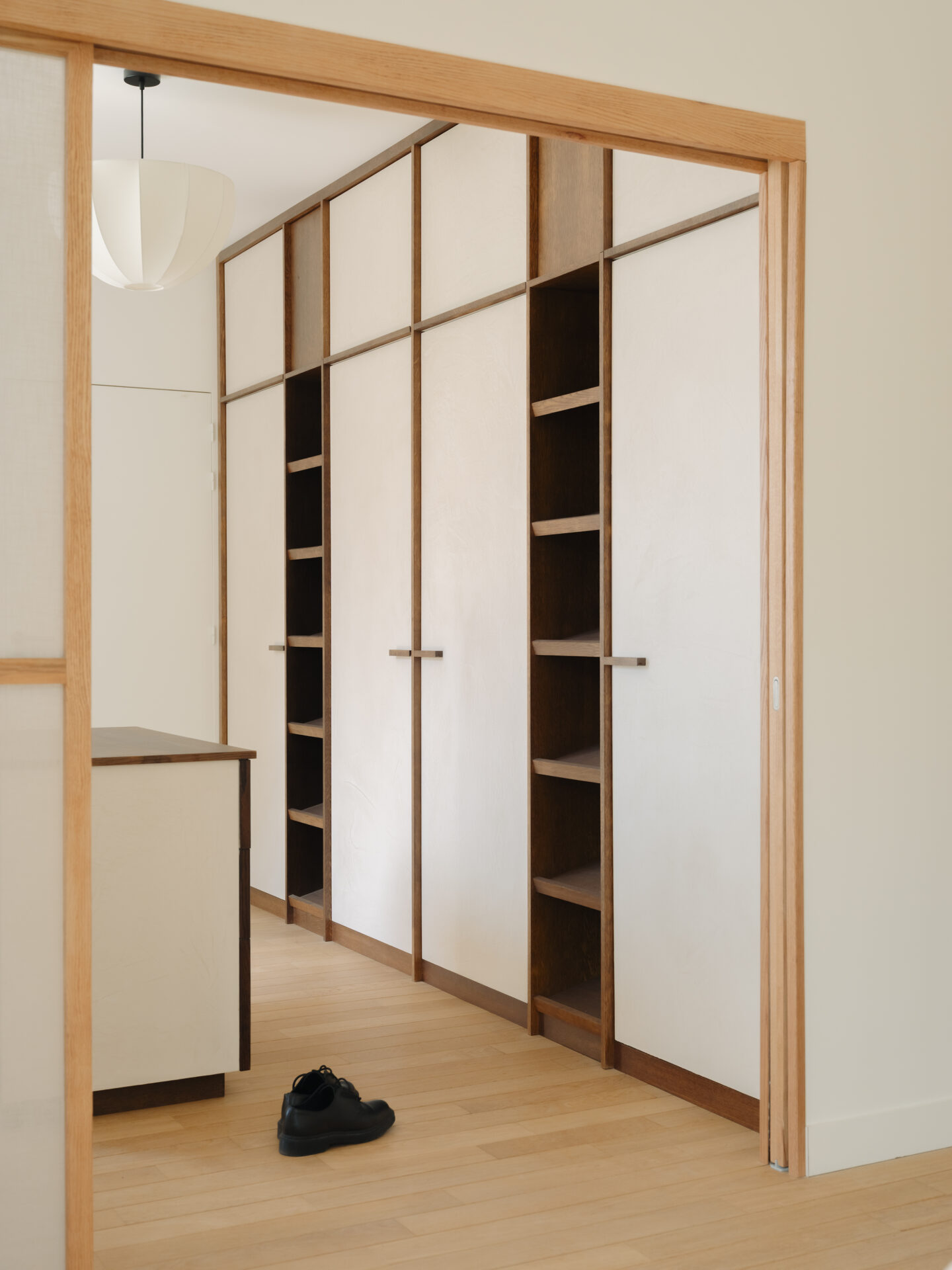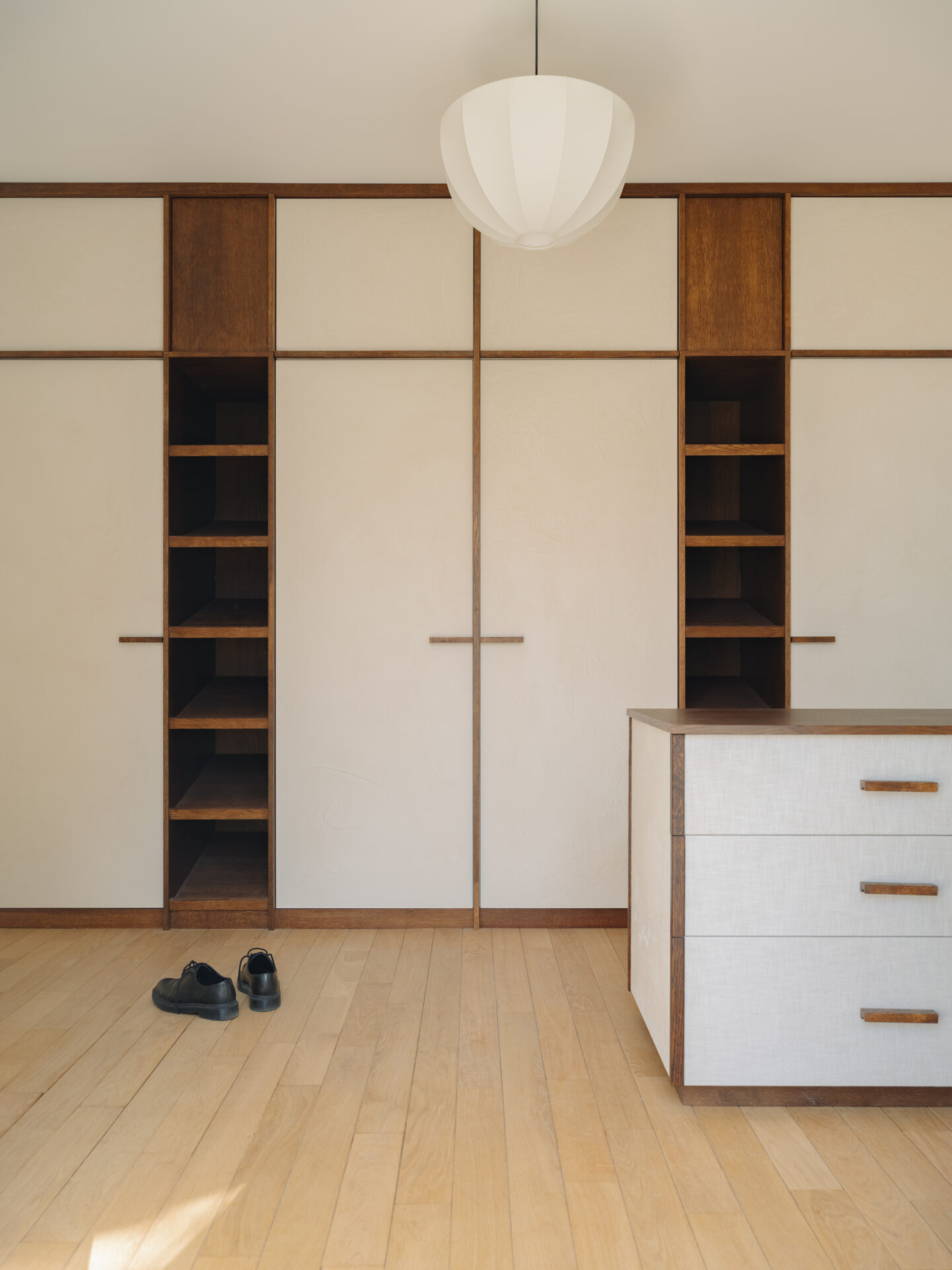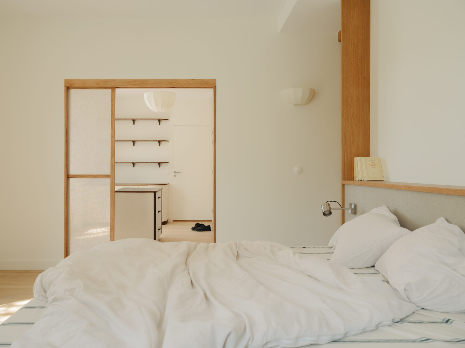 La partie nuit est constituée d’un dressing, d’une chambre et d’une salle de bains qui forment une grande suite parentale façonnée par deux très belles portes coulissantes.