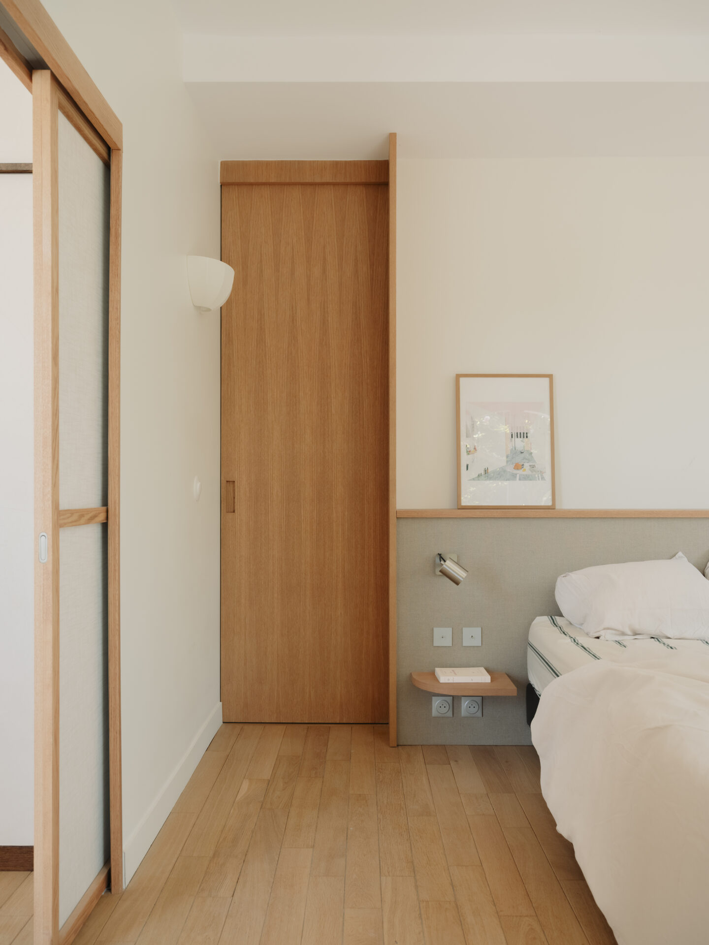 Coup de coeur pour la tête de lit vert matcha très clair et ses éléments de bois clair.