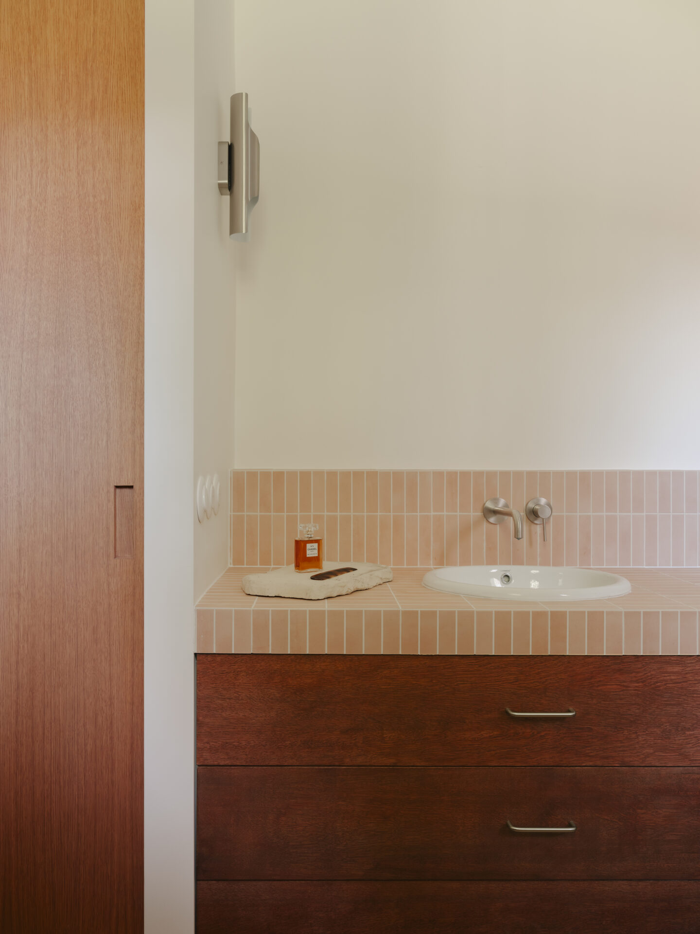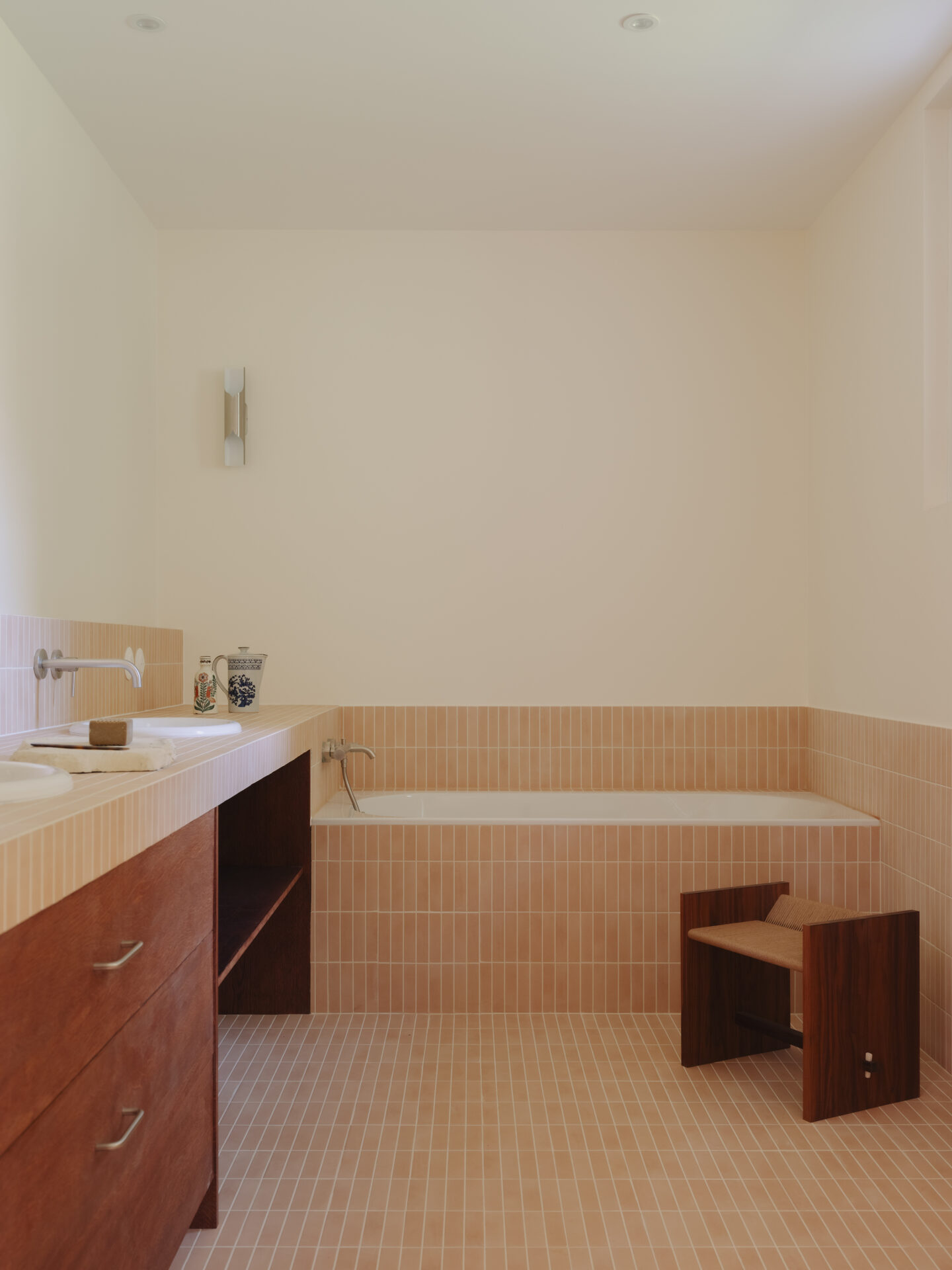 La salle de bains en rectangles de carreaux de céramique façon terre cuite et d’inspiration plus méditerranéenne que l’on rejoint grâce à de sublimes portes coulissantes toute hauteur que l’on croirait intégrées à la tête de lit.